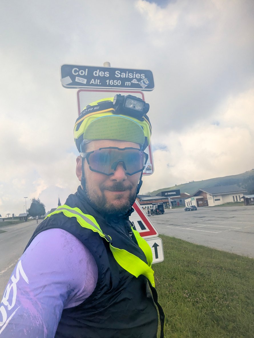 J'ai traversé la station de La Rosière et sa fameuse route rose. J'en ai profité pour m'arrêter un instant dans un restaurant et commander un sandwich, précieusement gardé pour la nuit. Le temps avançait et le soleil commençait à descendre alors que j'attaquais les derniers kilomètres du col. C'est là qu'un bruit assourdissant de voitures a attiré mon attention. Je me suis retourné et, en contrebas, j'ai aperçu plusieurs véhicules roulant à vive allure, driftant dans les lacets. Sans réfléchir, je me suis arrêté net, me plaçant de l'autre côté de la route, lampe allumée pour être le plus visible possible. Ils sont passés devant moi sans ralentir, une scène totalement incompréhensible qui m'a sincèrement fait peur. Plus tard, au sommet, j'ai échangé avec deux cyclistes italiens qui les avaient croisés dans la descente ; pour eux aussi, la situation avait été tout aussi dangereuse.