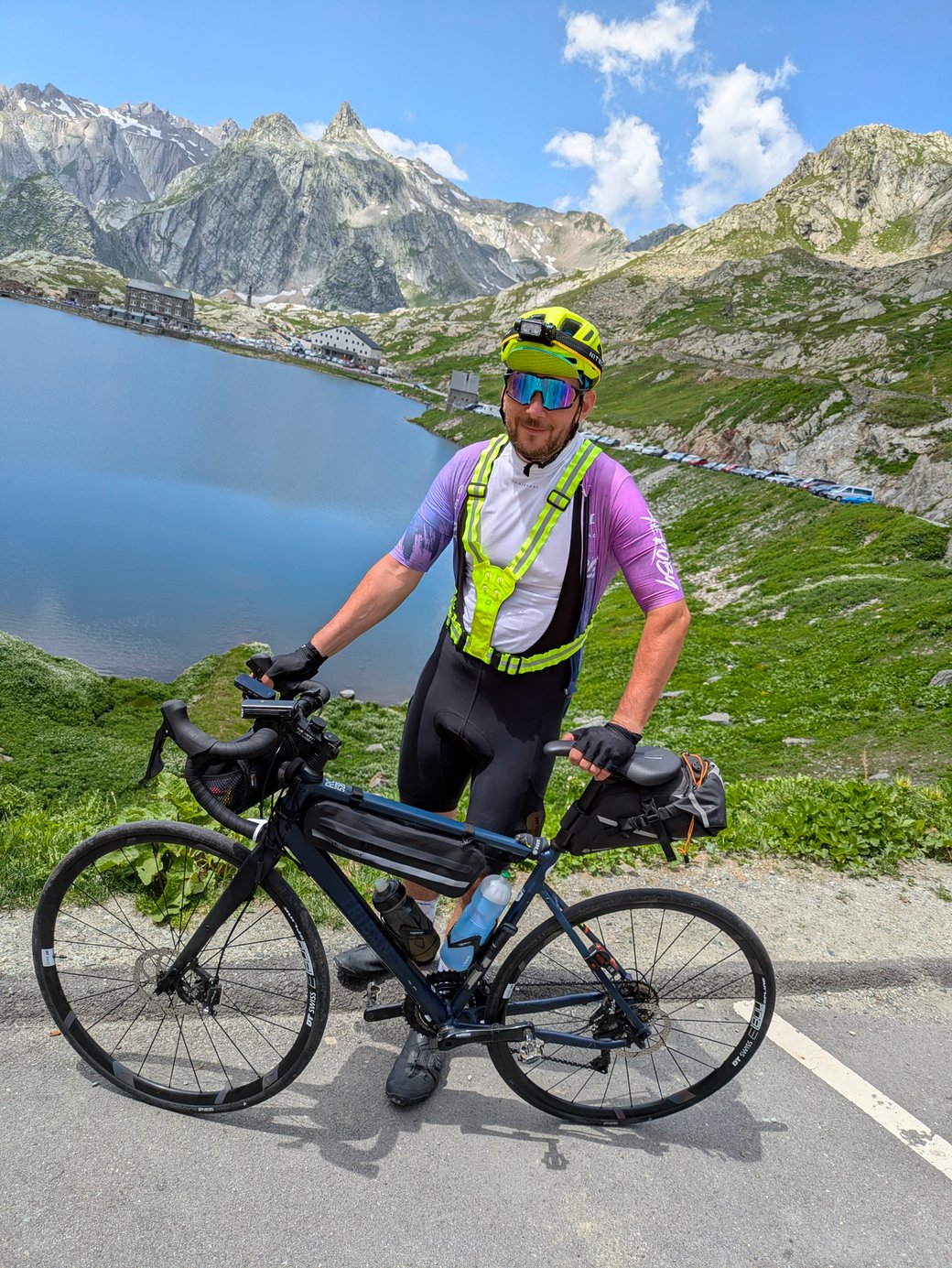 Réveil vers 3h du matin dans mon abri improvisé à Aoste. Il était temps d'attaquer la dernière grosse difficulté du parcours : la longue ascension du Col du Grand Saint Bernard. Devant moi s'étendaient 34 km et 1800 m de dénivelé positif. Le début de la montée s'est fait sur une route très passante, avec un ballet incessant de camions, de bus et de voitures. C'était épuisant, chaque dépassement demandant une concentration extrême. J'ai alterné pédalage et marche pour économiser mes forces, car je savais qu'il restait encore un long chemin.