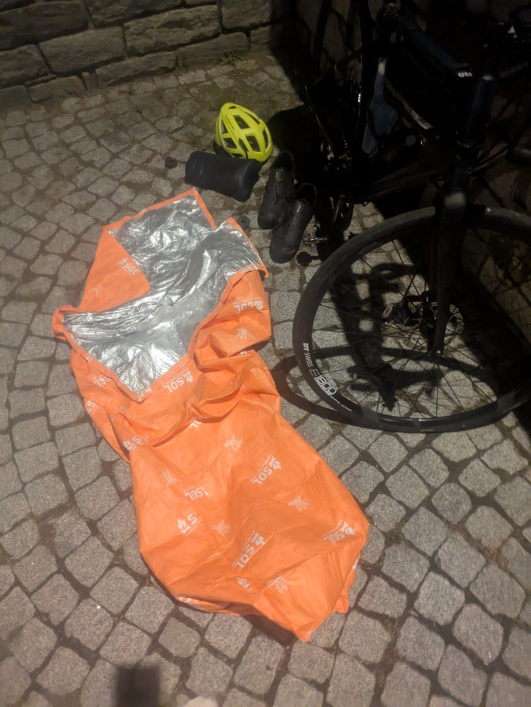 Il me restait encore une trentaine de kilomètres pour rejoindre Aoste, principalement un faux plat descendant sur une route assez passante. Je suis resté concentré sur ma trajectoire, mais les derniers kilomètres ont semblé interminables ; l'envie de me poser se faisait de plus en plus pressante. Une fois à Aoste, j'ai cherché de quoi manger. Puis, la quête d'un endroit pour dormir a commencé. Je dois avouer que c'est un point que je dois améliorer. J'ai fini par trouver un arrêt de bus, sorti mon bivy, et me suis emmitouflé dedans pour tenter de dormir. Les trois heures qui ont suivi ont été rythmées par le bruit incéssant des voitures montant le col.