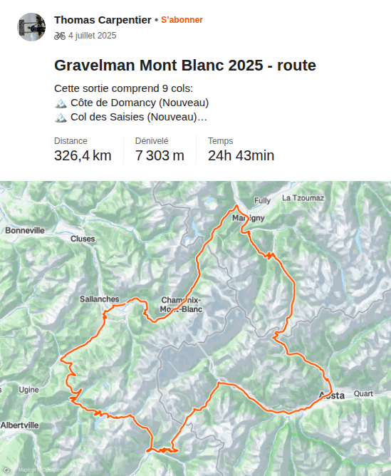 Ces deux dernières années, j'ai repoussé ce rêve, le laissant de côté faute de temps ou de courage. Mais en décembre 2024, j'ai pris une décision radicale : il était temps de me lancer. Après m’être inscrit à l’épreuve Gravelman Mont Blanc 2025 ( 350km version route ), j'ai donc entrepris un accompagnement de sept mois avec un coach, qui m’a structuré un plan d'entraînement. Ce fut un véritable défi que de concilier les séances avec ma vie professionnelle, les impératifs de la vie de famille, mes disponibilités et les inévitables petites gênes physiques qui ont jalonné cette préparation.