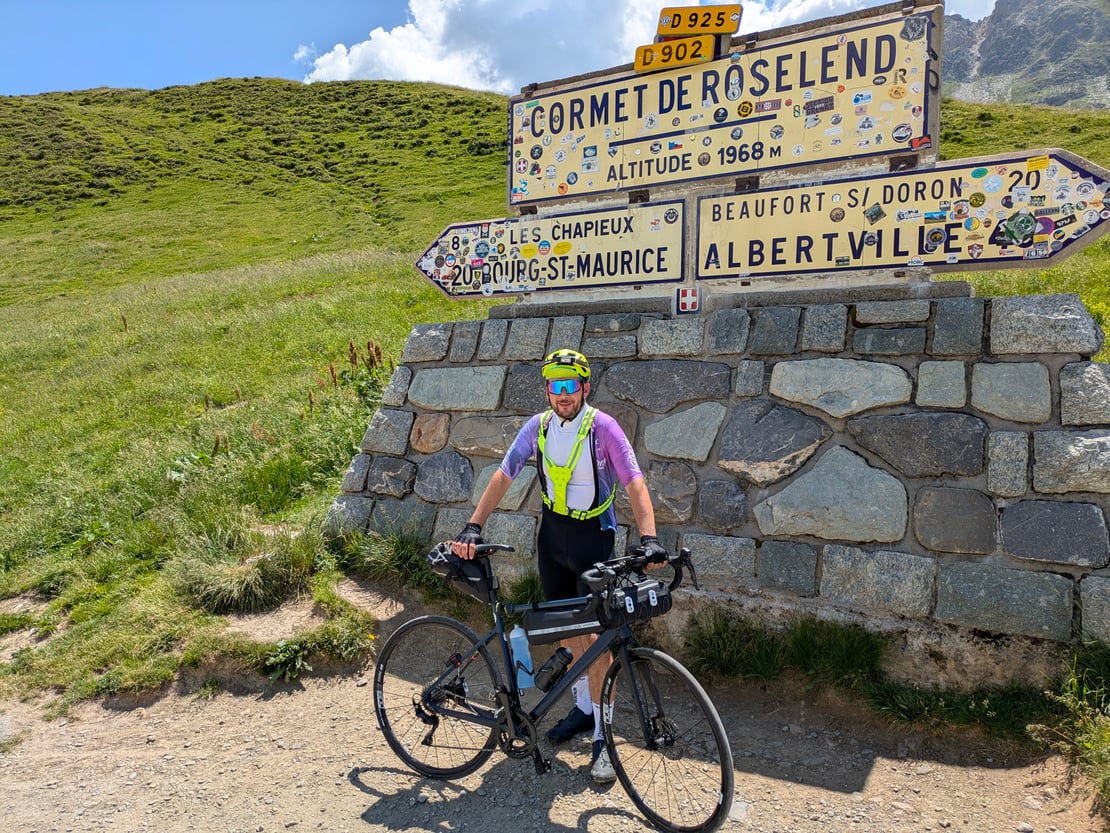 À partir de là, il me restait environ huit kilomètres avant d'atteindre le col. Je continuais d'avancer, et surprise ! J'ai croisé l'organisation du Gravelman, qui nous a offert un ravitaillement inattendu, une bouffée d'énergie bienvenue. Quelques instants plus tard, j'atteignais enfin le sommet du Cormet de Roselend, sous une chaleur étouffante de 36°C.